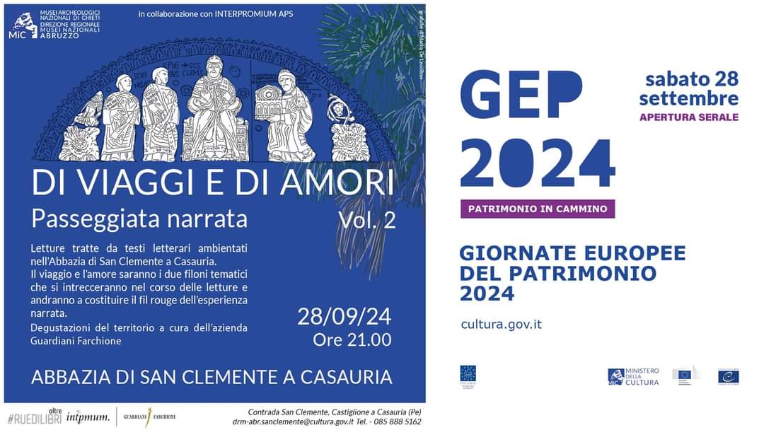 Nell’ambito delle Giornate europee del patrimonio 2024 torna l’iniziativa “Di viaggi e di amori”, passeggiata narrata nell’Abbazia di S. Clemente a Casauria, a Castiglione a Casauria (Pescara)