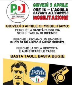 Partito democratico. “In pochi giorni – spiega il senatore Michele Fina, che si è impegnato a portare la battaglia in Parlamento e definisce il partito di Marsilio “Fratelli di tasse” – abbiamo raccolto duemila firme, e se ne aggiungono a centinaia ogni ora, contro la decisione della Giunta Marsilio di aumentare le tasse per far fronte al debito sanitario di 180 milioni di euro. Una decisione che scarica errori e malgoverno della destra sui cittadini: una grande ingiustizia per la quale chi sbaglia non paga e i cittadini sono vittime di un doppio danno, le tasse e la cattiva sanità. Domani sarò presente alla manifestazione indetta dai sindacati uniti e alla quale il mio partito ha aderito con convinzione. Contro questo enorme fallimento della destra al governo della Regione e del Paese invito tutti ad essere presenti”.