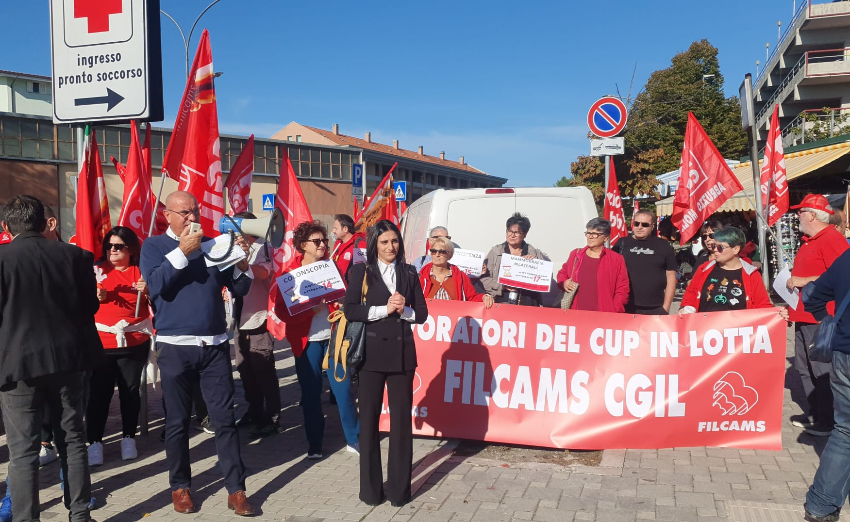 Con striscioni, bandiere e megafoni si sono ritrovati in molti stamani davanti al Cup dell’ospedale di Pescara per la mobilitazione indetta dalla FP Cgil in difesa della sanità pubblica.