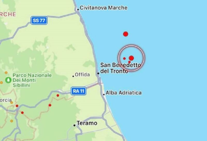 Una scossa di terremoto di magnitudo 4.2 nel mar Adriatico, di fronte alle coste tra Marche e Abruzzo, avvertita soprattutto ai piani alti degli edifici, ha fatto tornare alla mente delle popolazioni che abitano le due regioni i terremoti che tra il 2009 e il 2016 hanno seminato morte e paura tra gli abitanti: c’è chi è sceso in strada, chi ha affidato sui social le sue paure e chi ha rivissuto il trauma di qualche anno fa. Il traffico ferroviario sulla linea Ancona-Pescara è stato sospeso, in via precauzionale, nel tratto tra Alba Adriatica e Porto San Giorgio per una serie di verifiche tecniche da parte di Rfi che hanno dato esito negativo.