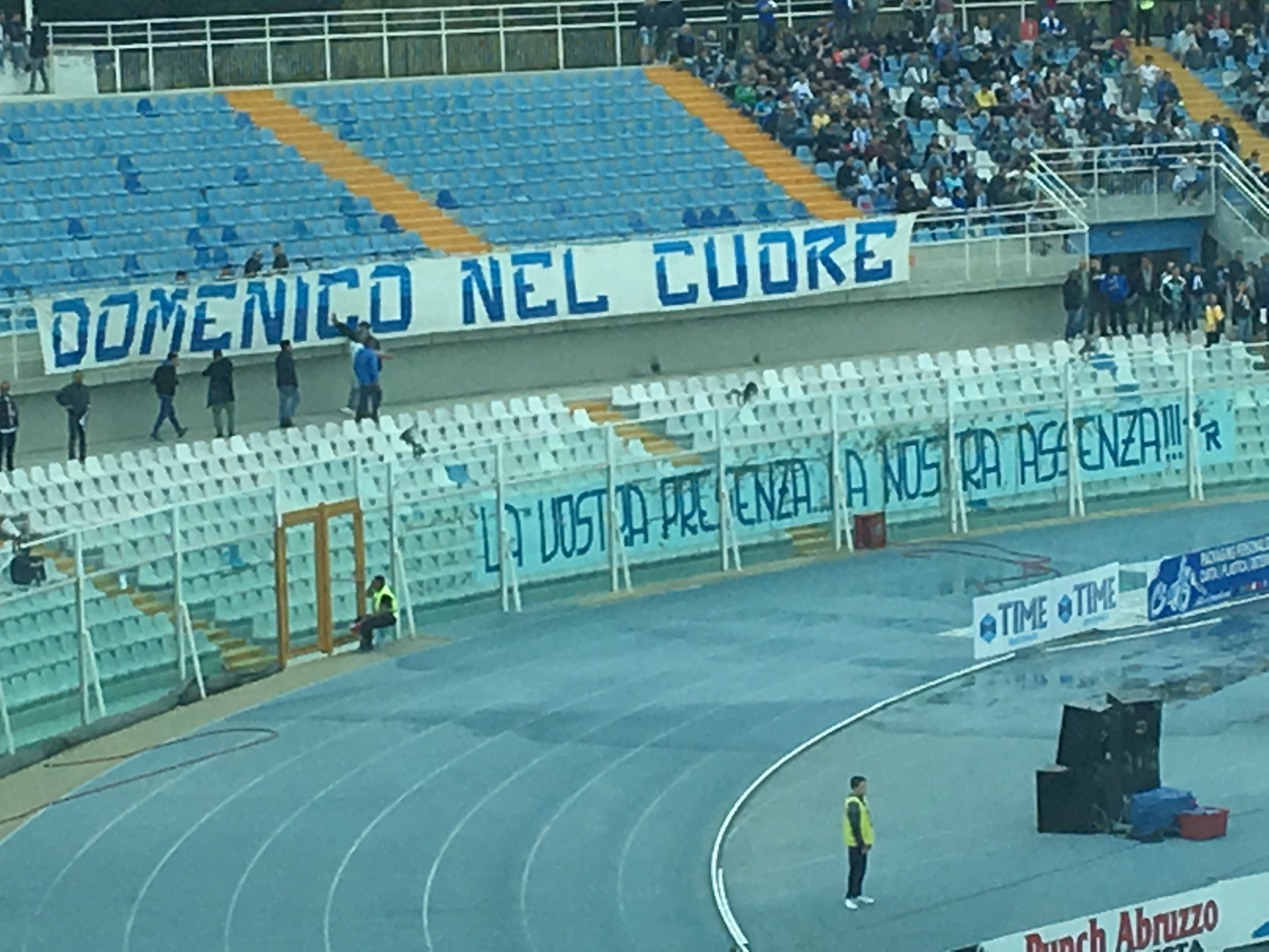 Il Crotone espugna l’Adriatico con una prodezza di Tonev nella ripresa. Finisce 1-0. Partita brutta e senza spunti. Due opportunità per Bahebeck nel primo tempo, Crotone mai pericoloso ma vincente grazie all’eurogol del neo entrato. Parapiglia in tribuna dopo il gol di Tonev : necessarie le forze dell’ordine con i dirigenti calabresi che hanno lasciato il settore a loro riservato. Alla mezz’ora espulso Benali per aver protestato in maniera troppo energica per un contatto in area non sanzionato da Russo. In foto la curva biancazzurra sempre vuota per protesta ma con uno striscione per ricordare Domenico.