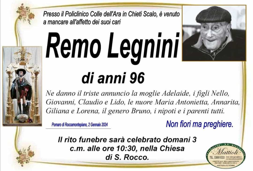 Remo Legnini si è spento al Policlinico Colle dell’Ara, a Chieti. Lascia la moglie Adelaide, i figli Nello, Claudio, Lido e Giovanni, le nuore, il genero e i nipoti. I funerali si terranno domani, mercoledì 3 gennaio, alle 10.30, nella chiesa di San Rocco a Roccampontepiano (Chieti).