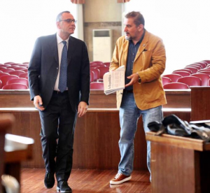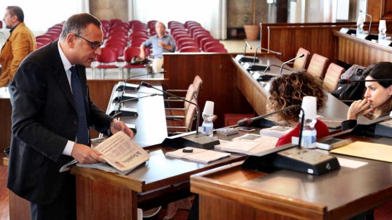 Il sindaco di Pescara, Marco Alessandrini, consegna delle copie del quotidiano ‘Repubblica’ ai consiglieri comunali del Movimento 5 Stelle, per prendere simbolicamente posizione rispetto alla “vergognosa campagna governativa contro i giornali, e contro Repubblica in particolare”.