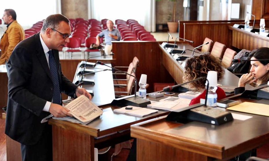 Il sindaco di Pescara, Marco Alessandrini, consegna delle copie del quotidiano ‘Repubblica’ ai consiglieri comunali del Movimento 5 Stelle, per prendere simbolicamente posizione rispetto alla “vergognosa campagna governativa contro i giornali, e contro Repubblica in particolare”.