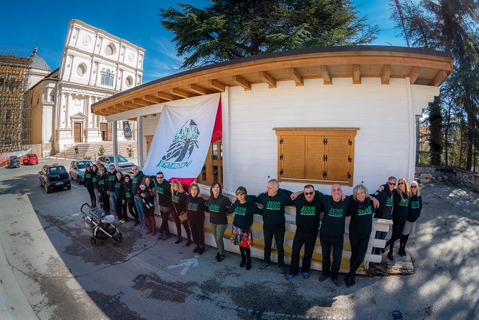 Gli attivisti hanno cinto simbolicamente in un abbraccio collettivo la casetta post sismica praticamente posta dinanzi alla basilica di San Bernardino, attualmente inutilizzata ed esempio di precarietà, ricettacolo di ogni immondizia, oggetto di atti vandalici e limitazione di possibili parcheggi.