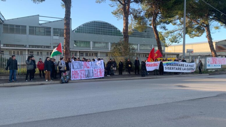 Manifestazione nel primo pomeriggio a Chieti Scalo, davanti alla Leonardo S.p.A., gruppo industriale internazionale che realizza capacità tecnologiche in ambito Aerospazio, Difesa & Sicurezza