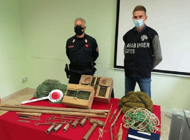 I Carabinieri Forestali operanti hanno sequestrato, oltre a tutto il materiale utilizzato (due reti per uccellagione di m 4 x 2, sei bastoni da fissaggio, due gabbiette in legno, un martello, cinque ingranaggi occhiellati per il movimento delle reti, spago, etc.), anche alcuni esemplari di Cardellino (Carduelis carduelis L.) e di Lucherino (Spinus spinus L.), specie particolarmente protette dalla Convenzione di Berna del 1979 sulla conservazione della vita selvatica e dei suoi biotopi in Europa.