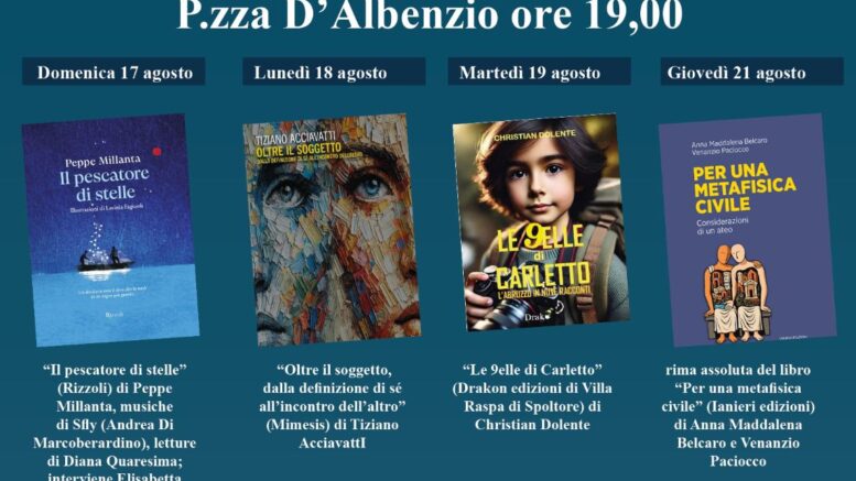 Verrà presentato inoltre “Letture Ensemble”, a cura dell’Assessorato alla Cultura con Nada Di Giandomenico, partner dell’evento è la Mondadori di Pescara che sarà presente con i libri; ecco le presentazioni che ci saranno a piazza D’Albenzio alle ore 19.00: