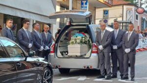 La bara scortata dalle ammiraglie delle società abruzzesi di ciclismo, della squadra marchigiana per la quale correva Simone, la Continental MG. K Vis Colors for Peace, e della società olandese per la quale aveva firmato appena la settimana scorsa.