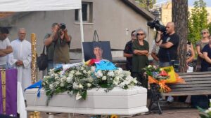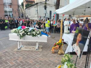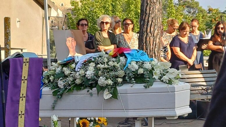 Simone arriva sulle note commoventi di un brano scelto dalla famiglia in una piazza assolata, calda e silenziosa. Gli amici, i compagni di bicicletta, i nonni piangono un sorriso che in tanti ricordano in città.
