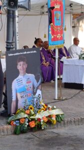 La bara bianca di Simone è stata portata a spalla per quelle decine di metri transennate prima di arrivare in Piazza Di Marzio nel centro storico del comune pescarese. Una funzione all’aperto, viste le centinaia di persone che si sono recate a dare l’ultimo saluto. Palloncini bianchi, musica, le squadre e i compagni schierati, il sindaco Chiara Trulli e il presidente della Provincia Ottavio De Martinis, e una grande gigantografia a salutare ‘Rogantino per sempre’, quel ragazzo passista veloce che invece stava passando professionista quasi con le qualità da scalatore.