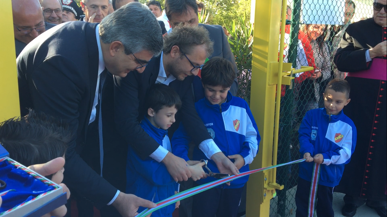 Dopo la mattinata passata a Pescara per parlare del nuovo stadio del calcio, il Ministro dello Sport Luca Lotti e il Presidente della Regione Luciano D’Alfonso sono stati a Lettomanoppello dove alle 15 3o è stato tagliato il nastro ed è stato inaugurato lo stadio. Un impianto bello e innovativo, bagno di folla per il Ministro che ha salutato tutti lanciando un messaggio importante per i tanti bimbi presenti. Ed è stato proprio un campioncino di domani a tagliare con le forbici il nastro. Tribuna gremita e paese in festa: un bel pomeriggio con la presenza anche del presidente della Serie C Gabriele Gravina e del presidente del Pescara Daniele Sebastiani