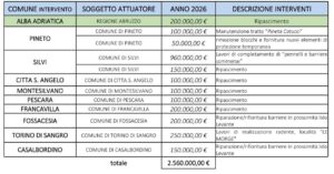 Come si evince dallo schema che pubblichiamo 10 sono i comuni beneficiari di fondi e interventi: Alba Adriatica, Pineto, Silvi, Città Sant’Angelo, Montesilvano, Pescara, Francavilla, Fossacesia, Torino di Sangro e Casalbordino.