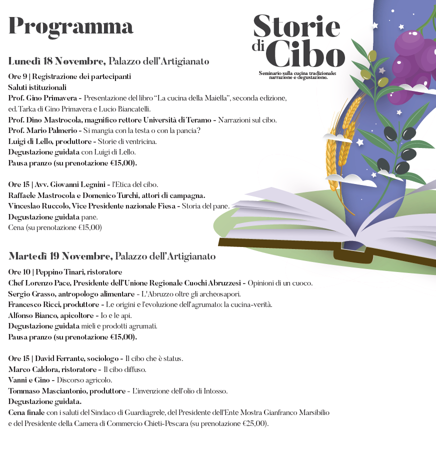 Storie ed aneddoti, riti e tradizioni, conditi dal sale della terra che accomuna le origini di tutti i relatori: sono questi gli ingredienti della prima edizione di Storie di Cibo, un evento in programma a Guardiagrele il 18 e 19 novembre.