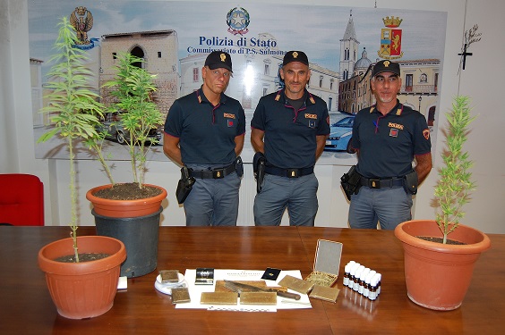 L’uomo e’ stato sorpreso dal personale della Squadra Volante del Commissariato di Sulmona, nel centro cittadino, nell’atto di cedere della sostanza stupefacente, del tipo hashish. La successiva perquisizione personale e locale, ha consentito di rinvenire nell’abitazione del pusher: 6 panetti piu’ 1 dose, di circa 8 grammi di sostanza tipo hashish, per un peso complessivo di 554 grammi circa, tre vasi coltivati con 5 piante del tipo marjuana, in ottimo stato vegetativo, 15 grammi di tritume essiccato di sostanza tipo marjuana, 2 bilancini di precisione, 1 coltello e 1 tagliere con residui della sostanza stupefacente porzionata. Al termine degli adempimenti di rito l’uomo e’ stato associato alla locale Casa di Reclusione, a disposizione dell’autorita’ giudiziaria competente. Il risultato operativo e’ scaturito anche a seguito di un’attenta attivita’ di indagine, sviluppatasi nel corso della giornata, dal personale dell’Ufficio Controllo del Territorio, caratterizzata dall’espletamento di pedinamenti ed appostamenti volti ad individuare un soggetto segnalato come possibile spacciatore.
