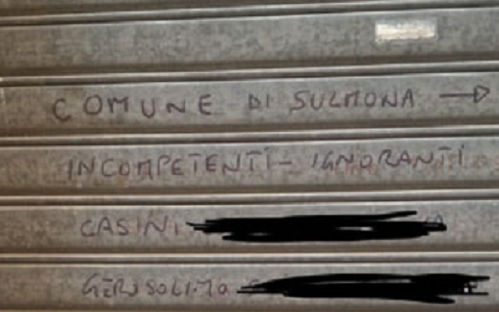 Sulla saracinesca di un negozio in centro a Sulmona sono comparse ingiurie contro il sindaco. Presi di mira, oltre Casini, anche D’Alfonso e Gerosolimo.