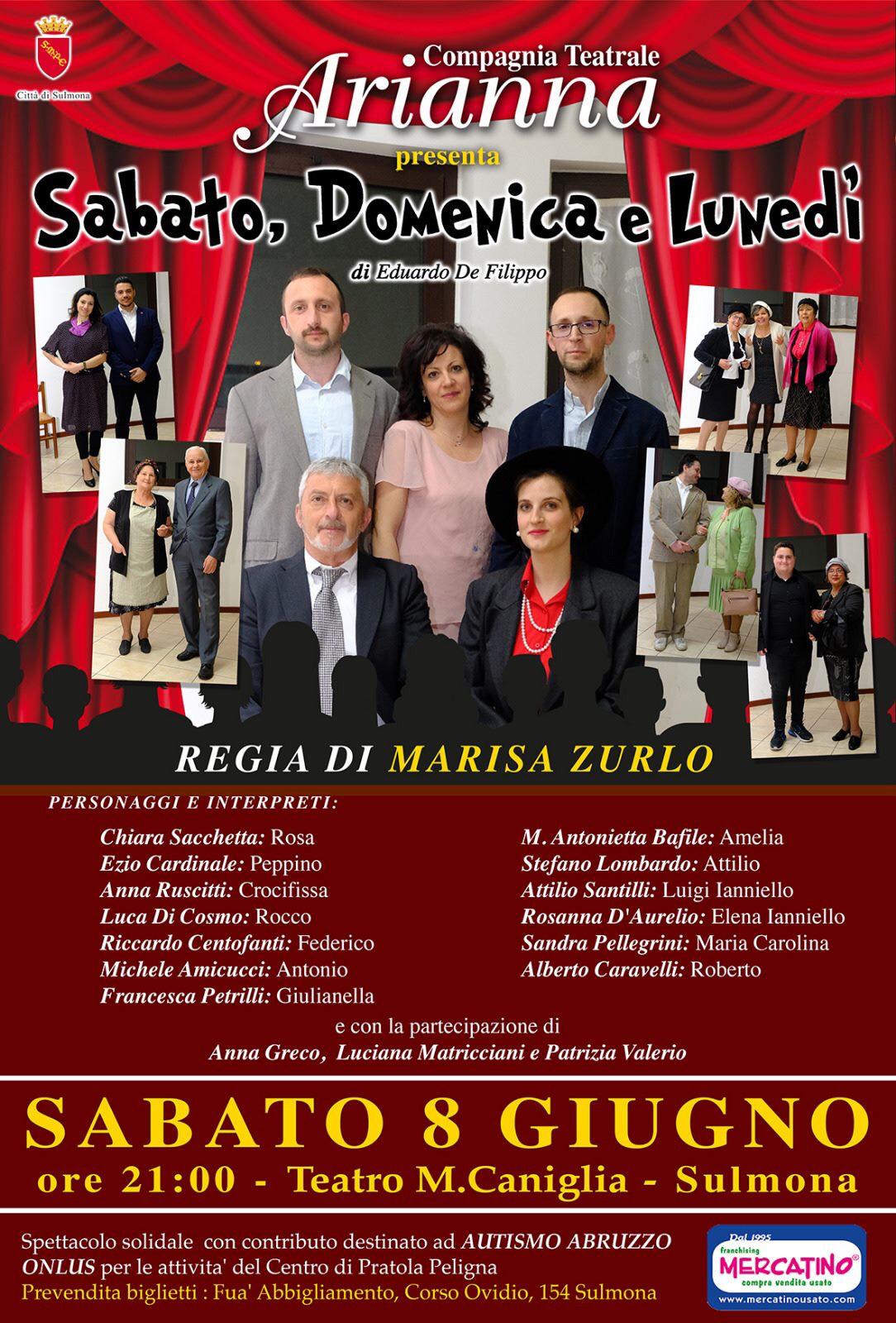 La compagnia teatrale Arianna presenta “Sabato, domenica e lunedì”, stasera al teatro Caniglia a Sulmona. L’intero ricavato sarà destinato ad attività integrative per il centro autismo di Pratola Peligna.