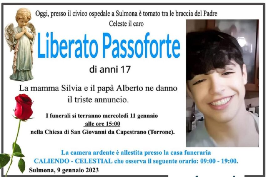 La morte lo a colto all’improvviso, Liberato Passoforte, “Libero” per i tanti amici, è morto a 17 anni probabilmente a causa della meningite. Profondo il dolore della mamma Silvana e del papà Alberto. Liberato, studente dell’Istituto Alberghiero è deceduto all’Ospedale di Sulmona dove, il giorno prima, era stato ricoverato d’urgenza nel reparto di Rianimazione. I medici sospettano che ha stroncare il giovane sia stata la meningite pneumococcica. La Direzione sanitaria ha disposto accurati esami. Sconvolta la comunità di Sulmona e numerosi sono stati i messaggi di cordoglio pubblicati sui social dopo aver appreso la tragica notizia. La camera ardente è stata allestita presso la casa funeraria Caliendo-Celestial. I funerali saranno officiati domani, mercoledì 11 gennaio alle ore 15,00 nella Chiesa di San Giovanni da Capestrano, nella frazione di Torrone.