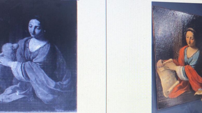 I Carabinieri del Nucleo Tutela del Patrimonio Culturale di Napoli hanno restituito alla Diocesi di Sulmona un dipinto, olio su tela di autore ignoto, raffigurante “Sant’Agnese con agnello che nella mano destra impugna la palma del martirio”. Nella foto l’originale e la sua alterazione per non destar sospetti ad una fiera