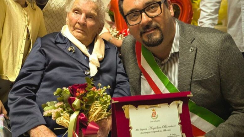 Per l’occasione, il primo cittadino le ha consegnato una targa a nome dell’Amministrazione Comunale. Molto legata alle tradizioni, come tutta la famiglia, la signora Angiolina ha dedicato la sua vita, insieme al marito Silvio Falconi, al lavoro nei campi e alla cura della famiglia. Madre di quattro figli, Anna Maria, Paolo, Adelaide e Gabriella, è nonna di 9 nipoti e di 12 pronipoti. Circondata dall’affetto di familiari ed amici, ieri ha festeggiato l’importante traguardo ricevendo il saluto dell’intera città di Teramo da parte del primo cittadino.