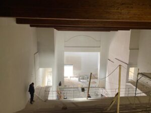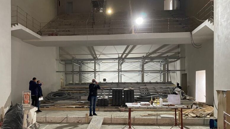L’intonacatura interna ha iniziato a restituire una forma alla bella sala da circa quattrocento posti, mentre devono essere ancora completati gli esterni.