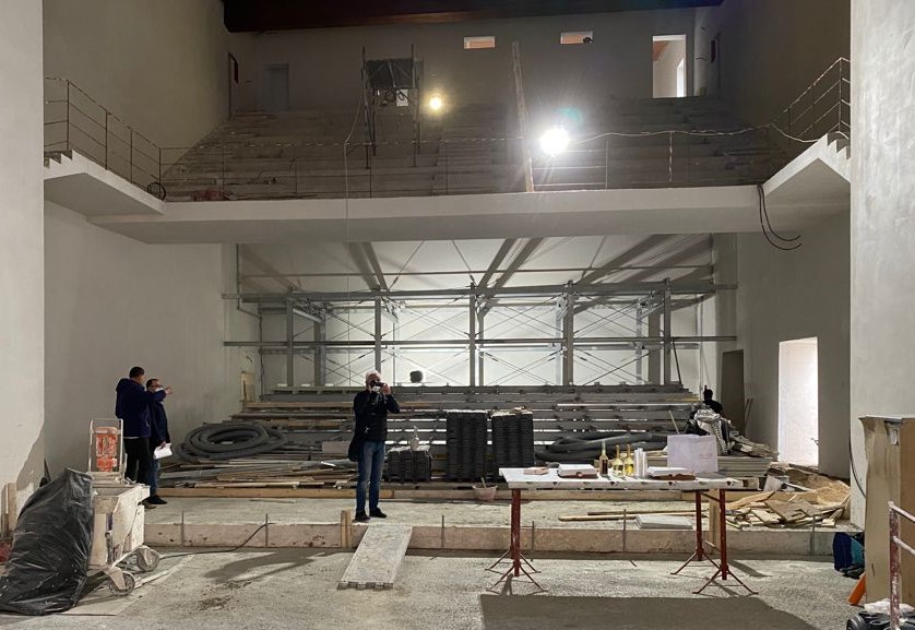 L’intonacatura interna ha iniziato a restituire una forma alla bella sala da circa quattrocento posti, mentre devono essere ancora completati gli esterni.