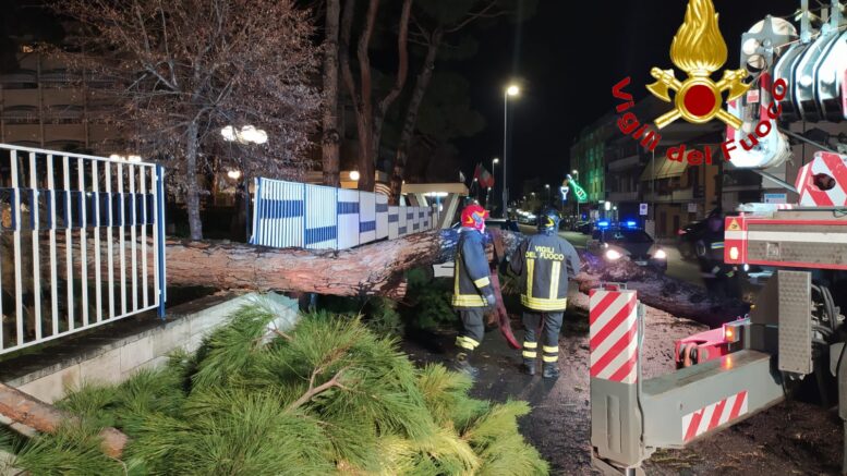 L’albero, un pino marittimo di circa venti metri di altezza piantato all’interno del giardino della Casa di Riposo “De Benedictis”, dopo essersi sradicato, si è abbattuto rovinosamente su viale Crispi invadendo completamente la sede stradale.