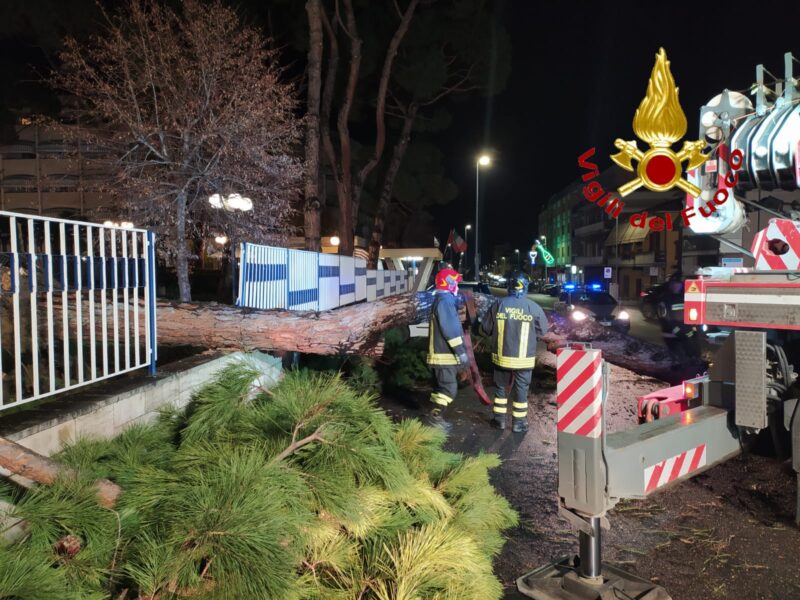 L’albero, un pino marittimo di circa venti metri di altezza piantato all’interno del giardino della Casa di Riposo “De Benedictis”, dopo essersi sradicato, si è abbattuto rovinosamente su viale Crispi invadendo completamente la sede stradale.