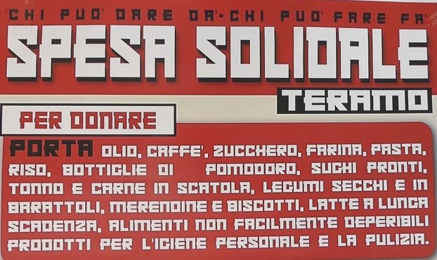 Partecipa alla raccolta di settembre della “Spesa Solidale”. Ti aspettiamo da mercoledì 1 settembre fino a venerdì 3 settembre, dalle 10:00 alle 13:00 e dalle 17:00 alle 20:00, presso la Casa del Popolo di Teramo, in via Nazario Sauro, 52.
