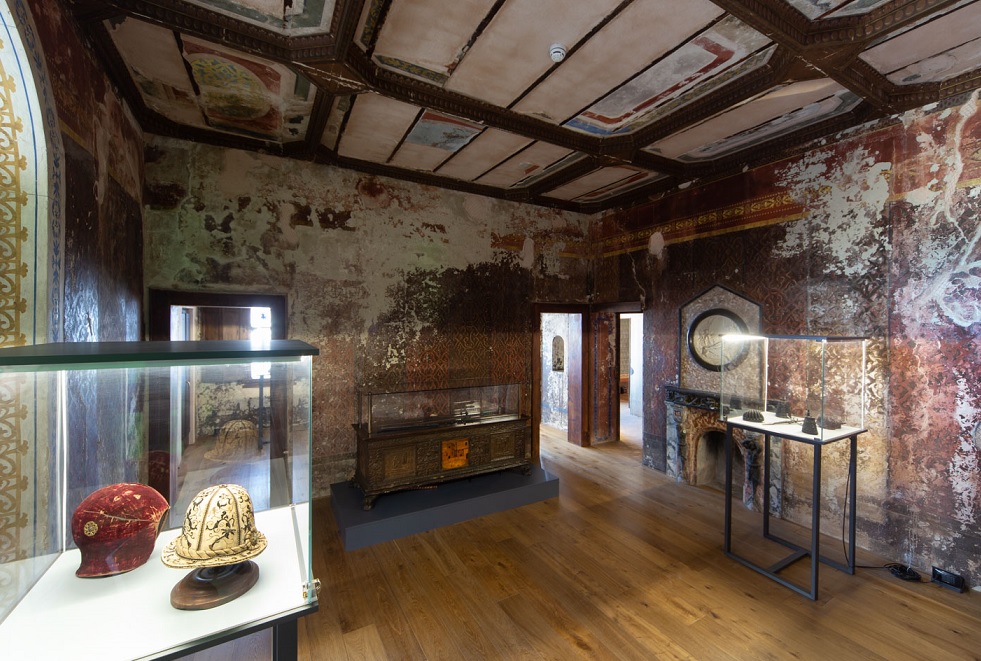 Il percorso espositivo si arricchisce di altri cofanetti preziosi e insoliti che ornano la Camera delle Meraviglie, come quello in legno e avorio con elementi decorativi vegetali e spiraliformi, probabilmente adoperato in ambito liturgico e databile alla metà del XVII secolo, rivestito all’interno con carta rossa decorata con motivi vegetali e animali impressi in oro. S’incontrano poi la piccola cassettina in ebano e osso caratterizzata da una singolare decorazione a marqueterie, tipica di una produzione artigiana sviluppatasi nella seconda metà del XIV secolo nell’area centroitaliana, in particolare toscana; il forzierino in rame rivestito di smalti blu e bianchi con raffinati ornamenti oro, che rientra nel novero di oggetti riferiti alla produzione veneziana quattro-cinquecentesca; l’affascinante coppa composta da una conchiglia innestata su un sostegno in rame dorato, con base circolare e profilo inciso ad acquaforte, ricondotta dalla critica alla cultura orafa del Cinquecento e dei primi anni del secolo successivo; la rarissima maschera da giustizia in acciaio brunito, modellata con i lineamenti di un uomo calvo di mezza età, composta da due parti congiunte prodotte nel nord Europa – verosimilmente in Germania o in Inghilterra – in epoche differenti, e poi assemblate in un unico manufatto nel XIX secolo; e il cappello maschile in pelle scamosciata di manifattura italiana, databile alla metà del Cinquecento.