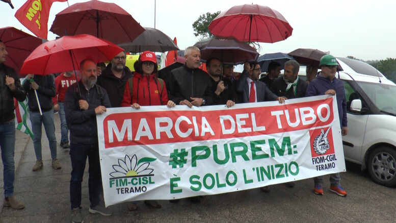 La pioggia non ha minacciato la grande partecipazione di lavoratrici e lavoratori alla “Marcia del Tubo”, la manifestazione organizzata in concomitanza dello sciopero proclamato per oggi dai sindacati Fim Cisl e Fiom Cgil di Teramo