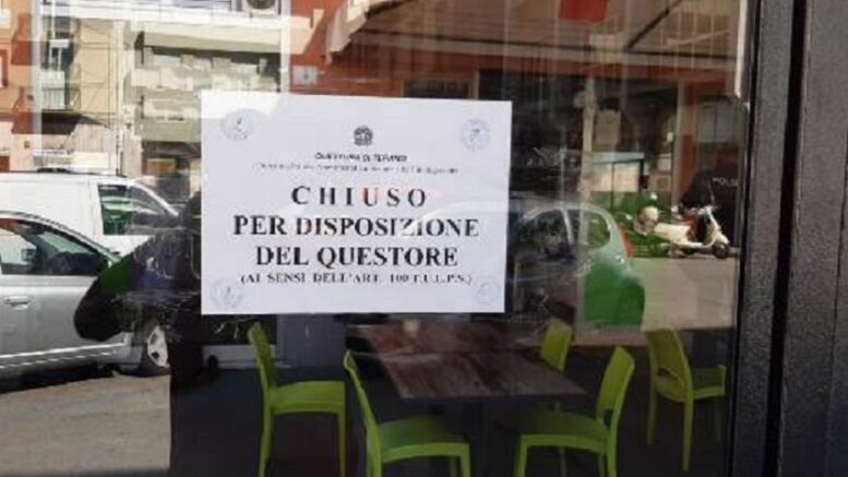 Il Questore della provincia di Teramo Carmine Soriente ha disposto la sospensione della licenza dell’attività di somministrazione di alimenti e bevande esercitata presso un noto bar cittadino per una settimana