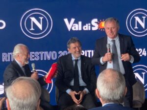 De Laurentis precisa subito: “Oggi qui parliamo del Trentino e dell’Abruzzo. Di altro parleremo in altri momenti. Mi rendo conto che siete divorati dalla curiosità ma oggi non posso darvi nessun notizia perchè non ne ho. Di certo vi confermo il nuovo Ds che così inciderà sulla squadra e sul mercato. Veniamo a noi partendo dal Trentino dove a breve mia figlia effettuerà tutti i necessari sopralluoghi. Ritiri che richiamano, e ne siamo lieti, tantissime persone. Avremo in ritardo, purtroppo, il ritorno di molti giocatori da altre competizioni. A Castel di Sangro di certo tre partite importanti e quindi il nuovo allenatore e la squadra!”. Il presidente del Napoli, Aurelio De Laurentiis, ha dichiarato: “A Dimaro ci saranno due amichevoli, una contro una squadra locale e un’altra con una di Serie B o C che poi comunicheremo. Poi a Castel di Sangro ci saranno amichevoli internazionali: il 28 luglio esordiremo con l’Adama Demirspor, una partita tradizionale ormai, il 31 con una squadra francese, il 3 agosto col Girona che torna quindi a Castel di Sangro”.