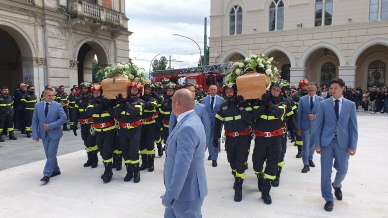 I feretri di Nico Civitella ed Emanuele Capone arrivano sopra i mezzi di chissà quanti interventi, avventure, salvataggi. Accanto alle bare, per tenerle in sicurezza ma soprattutto con occhi lucidi e mani che tremano, i colleghi di reparto. Le bare sono state accolte da applausi all’ingresso e all’uscita, con volo di palloncini bianchi, mentre il gruppo musicale di cui Capone faceva parte ha cantato i suoi due brani preferiti. Poco prima della conclusione del rito religioso ha preso la parola il comandante provinciale dei Vigili del fuoco di Chieti, Luca