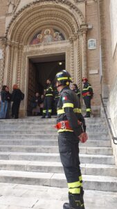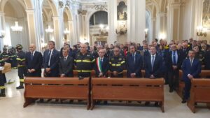 In cattedrale a sinistra dell’altare in prima fila il presidente Marsilio, con i vertici dei vigili del fuoco, Lorenzo Sospiri, il prefetto, il questore, il capo della Procura di Chieti Di Florio e il sindaco di Chieti Ferrara con la fascia tricolore.