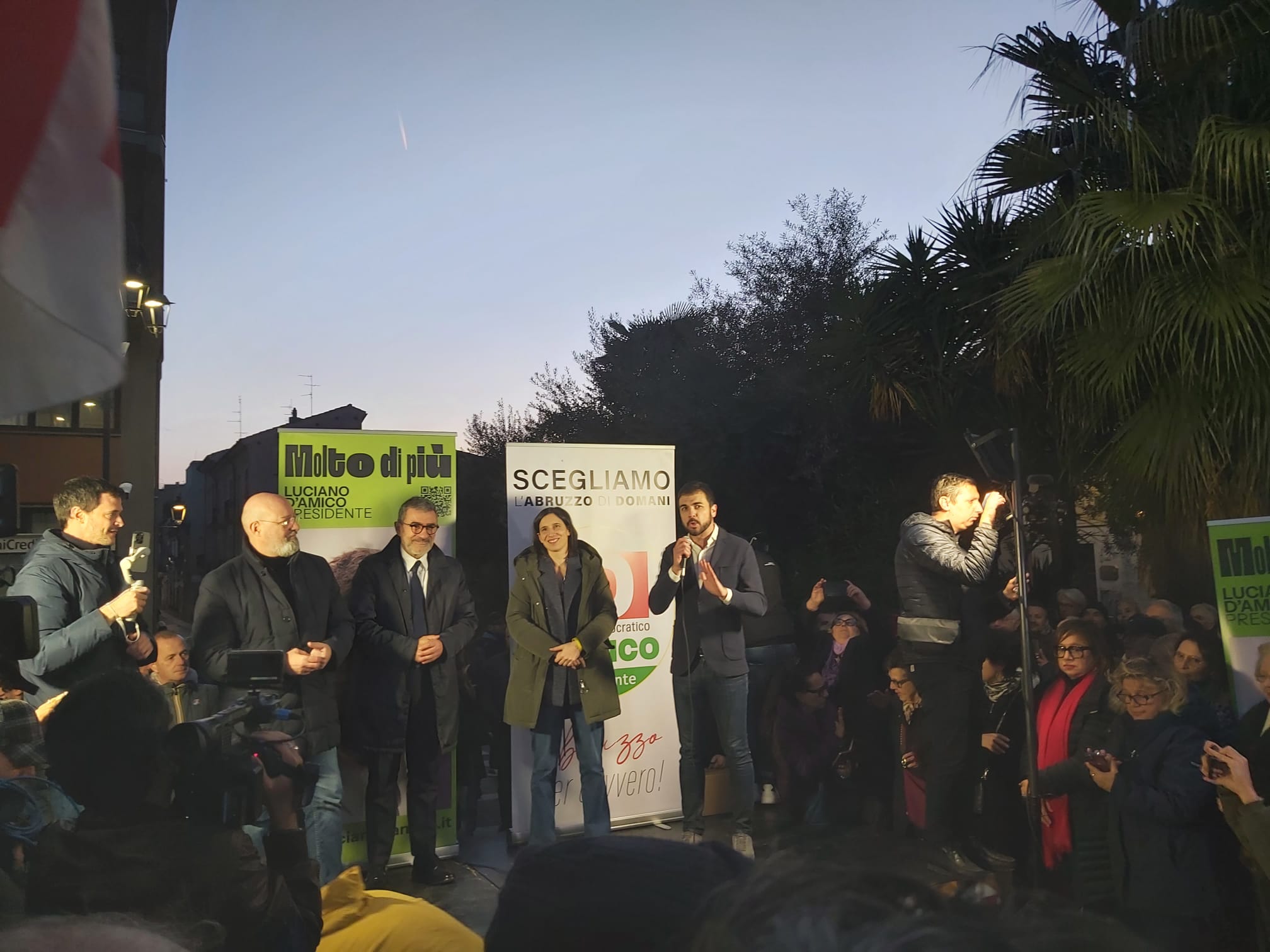 Breve siparietto a Pescara con la segretaria del Pd Elly Schlein, il presidente del Pd Stefano Bonaccini e il candidato alla presidenza della Regione, Luciano D’Amico. Appena saliti sul palco i tre hanno battuto le mani e canticchiato sulle note di Italodisco dei The Kolors, con cui gli organizzatori stavano intrattenendo il pubblico. Qualche accenno di ballo, poi è cominciato il comizio