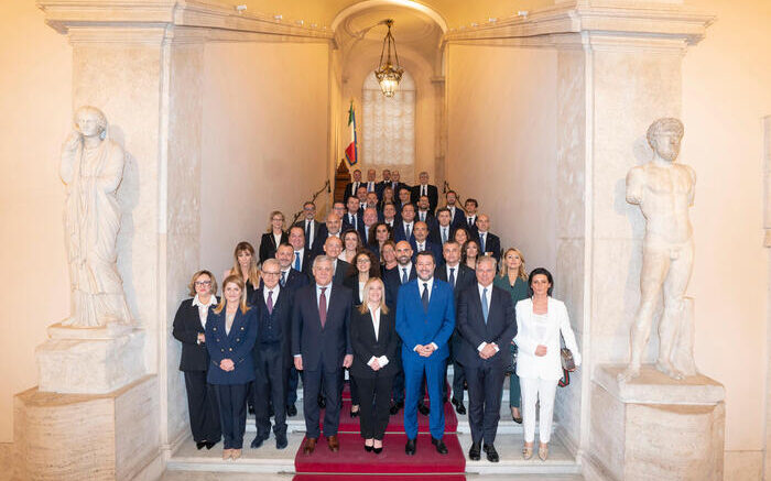 Visibilmente emozionati, qualcuno accompagnato anche dalla famiglia, i “prescelti” radunati nella sala dei Galeoni hanno sfilato uno ad uno davanti alla premier e al sottosegretario alla presidenza del Consiglio Alfredo Mantovano che, per tutti, ha letto la formula del giuramento. A suggellare la cerimonia uno scatto diffuso poi sui social in cui la presidente del Consiglio insieme ai due vicepremier (Tajani in completo scuro e Salvini invece che opta per il blu elettrico) viene ritratta con tutta la squadra sullo scalone di palazzo Chigi.