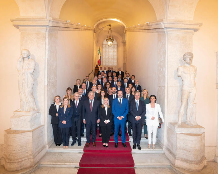 Visibilmente emozionati, qualcuno accompagnato anche dalla famiglia, i “prescelti” radunati nella sala dei Galeoni hanno sfilato uno ad uno davanti alla premier e al sottosegretario alla presidenza del Consiglio Alfredo Mantovano che, per tutti, ha letto la formula del giuramento. A suggellare la cerimonia uno scatto diffuso poi sui social in cui la presidente del Consiglio insieme ai due vicepremier (Tajani in completo scuro e Salvini invece che opta per il blu elettrico) viene ritratta con tutta la squadra sullo scalone di palazzo Chigi.