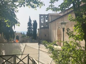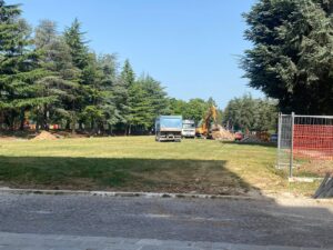 Da un lato in via Escrivà è operativo il cantiere che servirà a realizzare una sorta di gradinata con la sistemazione della scarpata che consentirà di seguire il giubileo aquilano in maniera più ordinata e già si vede la gradinata in pietra che si sta realizzando mentre sul prato della basilica a metà tappeto erboso ci sarà un maxi schermo. Si stanno effettuando degli scavi per montare una torre che sorreggerà lo schermo.