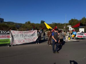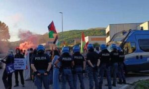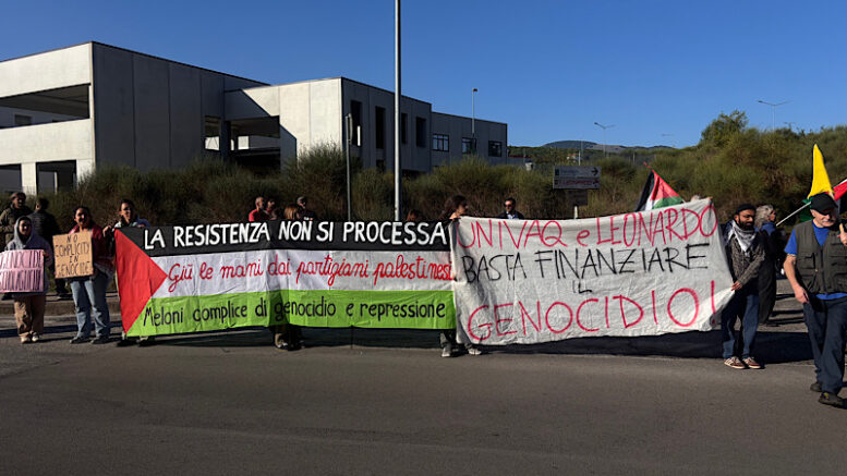 avviate il mese scorso. Tra i cartelli, anche uno con scritto “Sabotiamo la guerra, blocchiamo tutto”. Nel sit-in anche striscioni di solidarietà nei confronti dei tre palestinesi Anan Yaheesh, Ali Irar e Mansour Dogmosh sotto processo all’Aquila con l’accusa di terrorismo internazionale.