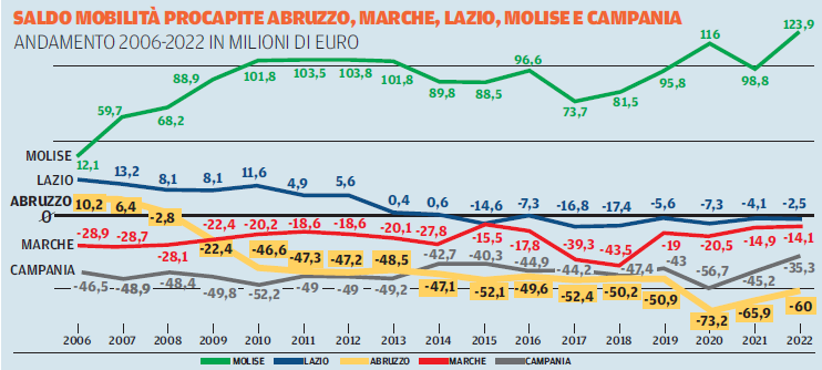 I NUMERI NON MENTONO. I numeri danno il quadro esatto di un andamento negativo ed esponenziale del “saldo della mobilità pro capite in Abruzzo” messo a confronto con le regioni a noi vicine. Correvano gli anni 2006, 2007 e il nostro saldo viaggiava con un segno più (+ 10,2 e + 6,4 milioni). La mobilità passiva esisteva, ma i pazienti di altre regioni che venivano in Abruzzo risultavano molti di più degli abruzzesi in fuga. Abruzzo e Lazio erano praticamente appaiati, le Marche soffrivano per l’esodo e la Campania indossava la maglia nera, nerissima, con un meno 46 milioni di euro. Ma il quadro che il report Oasi Unibocconi offre, quindici anni dopo, è impressionante. L’Abruzzo è precipitato nel baratro, con meno 60 milioni di euro nel 2022. Al contrario di Campania e Marche hanno nettamente ridotto i propri saldi negativi. Anche il Lazio viaggia quasi in pareggio mentre il Molise gode da anni di una mobilità attiva dominante che l’ha portato a raggiungere il valore di + 123,9 milioni, come se fosse una regione del Nord Italia.