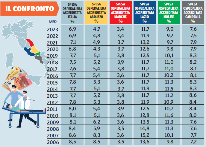 LA LOTTA IMPARI. Nulla accade per caso. Ma torniamo alle statistiche, ai dati inconfutabili. Da quel momento in poi, in Abruzzo, l’andamento della spesa ospedaliera accreditata scende in maniera consistente. Da oltre 200 milioni di euro, in quindici anni, precipita a 140 milioni. La lotta diventa impari con le regioni confinanti e concorrenti, Marche, Lazio, Molise e Campania che, a partire proprio da quel famigerato 18 febbraio 2010, cominciano ad incassare fior di milioni dall’Abruzzo e dagli abruzzesi. Da noi, invece, è scattato il taglio che lascia impotenti di reagire, bloccati da una spesa sanitaria decapitata. Ecco il riscontro in numeri: la spesa prevista nel budget regionale per l’ospedalità privata scende, in quindici anni, dall’8,5% al 4,7%. Mentre Lazio, Molise e Campania vantano portafogli rispettivamente dell’11,7, il 9 e il 7,6 per cento. L’equazione è molto semplice: quella spesa, decurtata in Abruzzo, ha incrementato, negli anni successivi al 2010, il mostro della mobilità passiva fino a saldi negativi record, tamponati solo lo scorso anno grazie a una delibera dell’attuale giunta regionale che ha concesso una somma extra per le prestazioni di alta specializzazione. «Li ho massacrati!», c’è scritto in quella intercettazione telefonica. Così è stato. Il meccanismo è diabolico, per nulla conveniente ad una Regione che pensando di risparmiare spende molto di più. Ma dove si curano i pazienti in fuga dall’Abruzzo e per quali prestazioni lo fanno? Anche in questo caso i report statistici vengono in aiuto della nostra inchiesta, il data journalism che si avvicina alla verità più di ogni altra forma di giornalismo.
