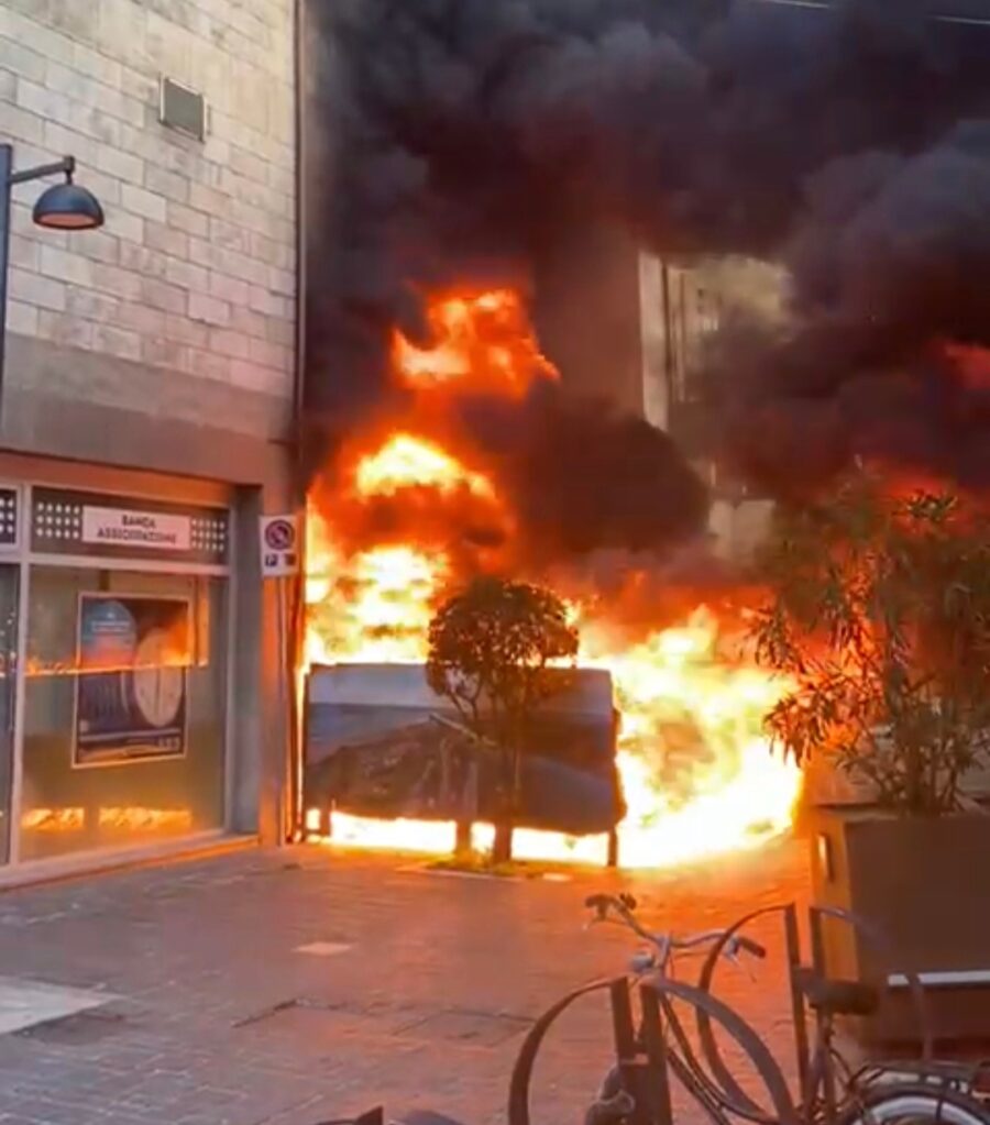 Erano da poco passate le 8 di questa mattina quando dai cassonetti dell’immondizia a ridosso dell’Istituto Banca Intesa San Paolo in via Roma angolo via Fiume a Pescara sono sprigionate le fiamme alte decine di metri. Subito dopo si è levata anche un’intensa colonna di fumo nera che ha annerito la facciata dell’istituto di credito. La banca è stata chiusa per motivi di sicurezza. Danneggiato seriamente uno dei locali adiacente all’isola ecologica. Danni ingenti anche ai locali situati al primo piano. Sul posto sono prontamente intervenuti i Vigili del Fuoco e gli agenti della Questura di Pescara e della Polizia Locale. L’intera area è stata transennata per consentire le operazioni di spegnimento. Non si esclude nessuna ipotesi sull’origine del rogo neanche quella legata agli anarchici, anche se sul posto non sono stati trovati messaggi di rivendicazione. Stanno indagando Squadra Mobile, Volanti ed anche la Digos, anche quest’ultima, con un proprio dirigente, sul posto per volontà del Questore per valutare eventuali matrici anarchice, vista la protesta che sta divampando in Italia per la vicenda Cospito. In mattinata agenti della Squadra Mobile anche presso la cittadella della sicurezza in Viale Circuito per visionare le immagini delle telecamere di video sorveglianza poste su Corso Vittorio Emanuele.