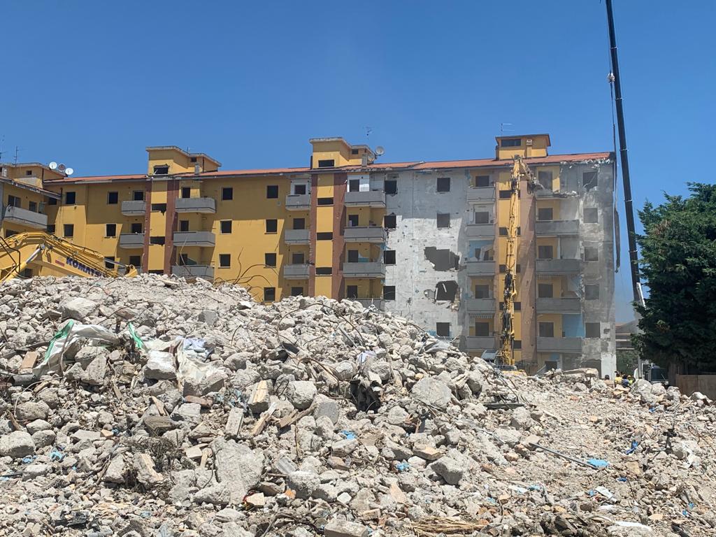Secondo il cronoprogramma la demolizione delle 3 palazzine iniziata martedì scorso sarà completata a fine agosto. Oggi le ruspe sono tornate al lavoro alla presenza di autorità regionali, comunali, tecnici, vigili urbani e personale dell’Ater proprietaria dell’immobile.