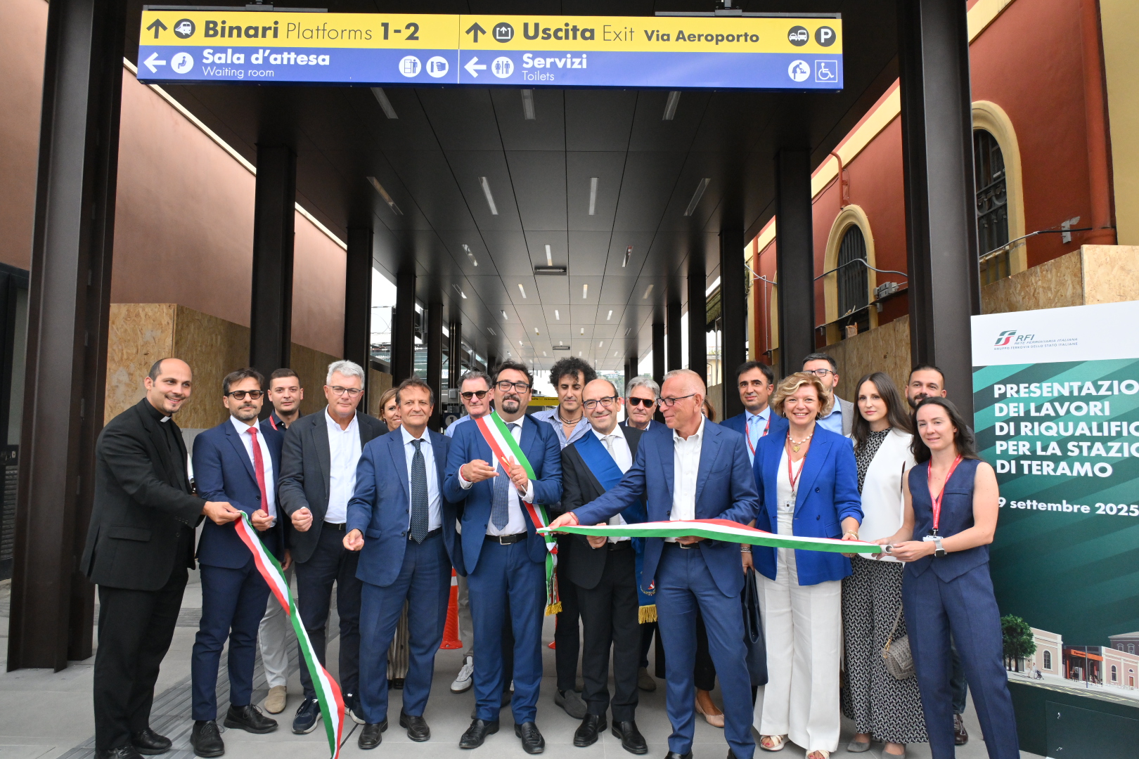 Taglio del nastro per gli interventi sull’accessibilità della stazione di Teramo, oggetto di un importante intervento di riqualificazione complessiva effettuato da RFI (Gruppo FS Italiane). Marciapiedi alti, nuove pensiline, percorsi tattili, nuovi gli impianti di illuminazione e di informazione al pubblico: 26 milioni di euro l’investimento complessivo
