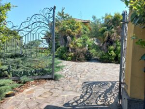 La villa, a cui si accede da un cancello, ha un ampio giardino in cui sono presenti statue e altri arredi da esterno.