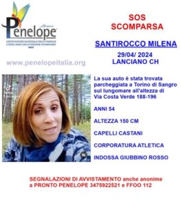 Aveva detto al figlio che sarebbe andata a fare una passeggiata sul lungomare di Torino di Sangro, ma non è più tornata. Milena Santirocco, 54 anni, coreografa ed insegnante di ballo di Lanciano è sparita nel nulla. A denunciare la sua scomparsa il figlio che non l’ha vista rientrare a casa. Unico indizio la sua Renault Clio trovata parcheggiata in Via Costa Verde, in Contrada di Borgata Marina a Torino di Sangro. Separata e madre di due figli, con uno dei quali vive. Sono partite subito le ricerche da parte della Polizia coordinate dalla Dirigente Miriam D’Attanasio e dei Vigili del Fuoco del distaccamento di Lanciano. Donna particolarmente attiva e sportiva esperta di fitness e maestra di danza moderna e contemporanea, Milena dirige un’associazione sportiva dilettantistica e si occupa anche di musicoterapia, nulla, al momento, lascia presagire ad un allontanamento volontario. Il suo telefono cellulare risulta irraggiungibile da domenica sera, al momento della scomparsa indossava un giubbino rosso.