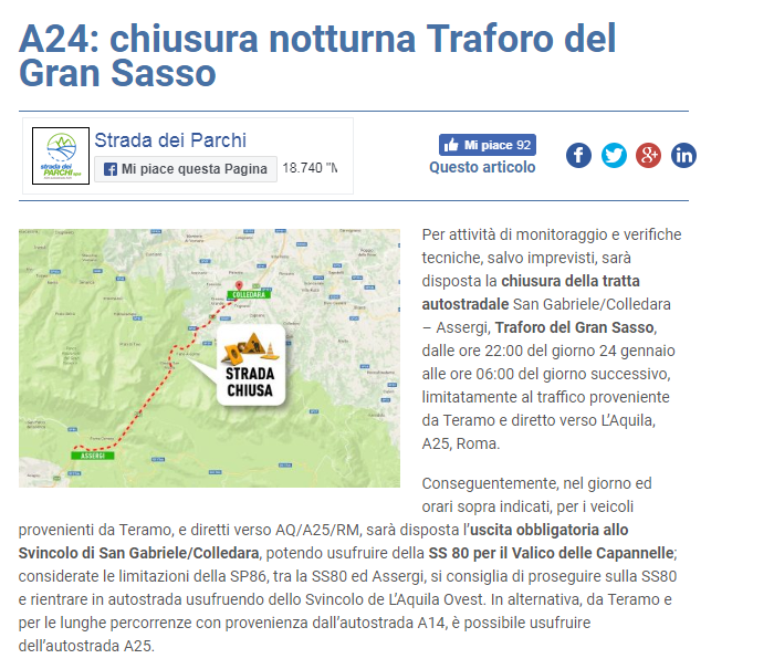 “Considerate le limitazioni della SP86, tra la SS80 ed Assergi – si legge sul sito di Strada dei Parchi – si consiglia di proseguire sulla SS80 e rientrare in autostrada usufruendo dello svincolo L’Aquila Ovest. In alternativa, da Teramo e per le lunghe percorrenze con provenienza dall’autostrada A14, è possibile usufruire dell’autostrada A25”.