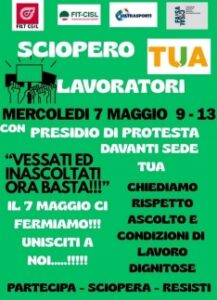 Domani, mercoledì 7 maggio, sciopero di quattro ore dei lavoratori Tua, l’azienda unica del trasporto abruzzese. A proclamarlo sono le segreterie regionali di Filt Cgil, Fit Cisl, Uiltrasporti e Faisa Cisal, “a seguito dell’ennesimo fallimento dei tentativi di conciliazione” con la società.