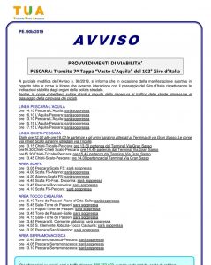 In concomitanza col passaggio della 7^ tappa Vasto – L’Aquila del 102° Giro d’Italia, Tua sospende alcune corse per la giornata di domani, venerdì 17 maggio 2019. Ecco quali.